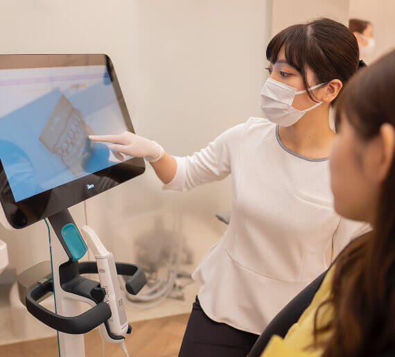 まず初めにどういった部分が気になるかなどの矯正についての問診票をご記入いただきます。その後、お口全体のレントゲン撮影・口腔内のお写真・お顔の写真・光学スキャナーでのスキャニングを行います。それらを基に矯正についてお話させていただきます。