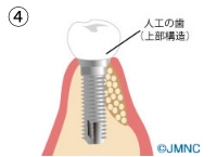 個人差はありますが、上顎では6か月、下顎では3か月ほど骨とインプラント体が結合するのを待ちます。その間ご希望があれば仮歯を着けることも可能です。その後2次オペ(インプラント体に上部構造を着けるための前段階のオペ)を行います。歯茎治癒を待ち、上部構造の型取りを行います。仮試適を経て、上部構造を着けます。