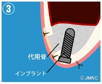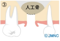 骨補填材を入れてメンブレンという特殊な膜で覆い、あごの骨が再生するスペースを確保します。